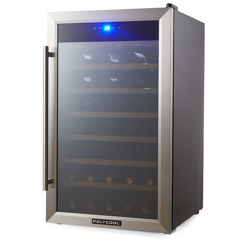 POLYCOOL 34 Bottle Wine Bar Fridge, Under Bench, Glass Door w/ Stainless Steel Frame, Sliding Shelves, Silver