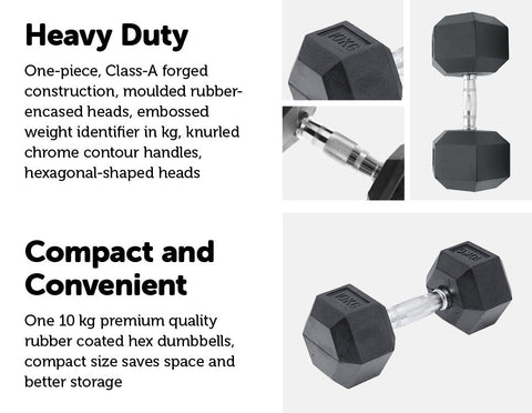 Take your workout to a new level with our commercial rubber hex 10kg dumbbell
