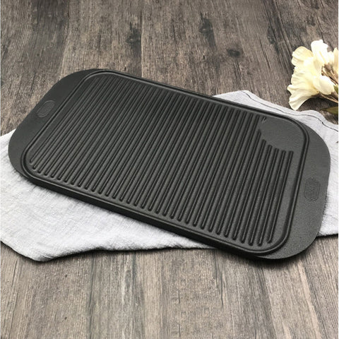 - The sides of this large rectangular cast iron grill skillet feature a natural surface and grease slopes to drain off fat in food to deliver healthy meals that are both nutritious and delicious