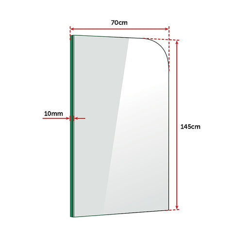 This gleaming shower door measures a generous 700 x 1450mm and features 10mm Australian standard tempered glass. The rounded-top panel is not only attractive, it is safe to use for all members of the family. The sturdy hardware on this shower door ensures safety and dependability. The elegant patch hardware add to the panel"s aesthetic appeal.