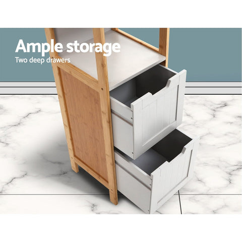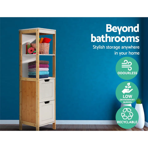 Need more storage but just do not have enough floor space in your bathroom? Our slim Artiss Bathroom Cabinet may just be the solution for you. The slim cabinet has a space-saving design, meaning it only uses up a tiny bit of floor space and can get into all the tricky nooks and crannies. Made of eco-friendly bamboo and MDF board and finished with smooth varnish, the cabinet features sturdy construction and four tiers of storage. With two open shelves on top and two deep drawers with cut-out handles below, the cabinet provides more than ample space for all your bathroom essentials. Better still, the cabinet can also be used as a storage cabinet in your kitchen, pantry or family room.