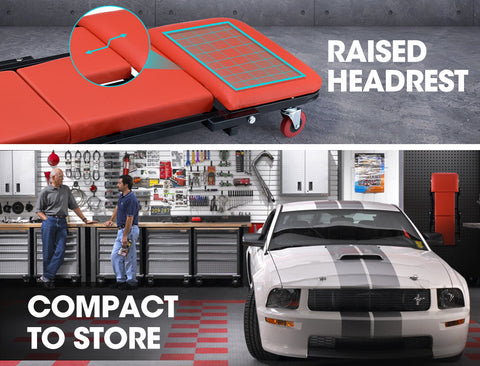 This smart design transforms from a creeper to a rolling Z-shaped mechanics stool in seconds with the pull of a ring, no tools needed! When in the flat creeper position it is compact and easy to store somewhere, or even hang on the wall of your garage.