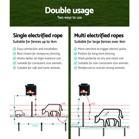 Whether it is used on the farm or around your suburban home,the set can be effective in either environment. Sporting a basic and simple-to-install design, you can have it up in a matter of minutes. Our fence energiser is compact, lightweight and versatile - making it an effective low maintenance item around the property.