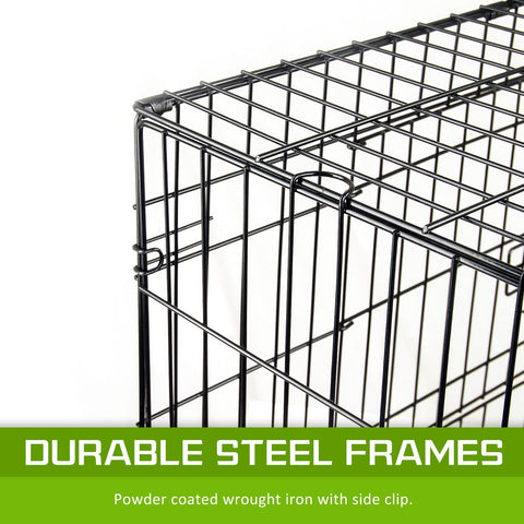 This convenient wire dog crate feature double access doors that provide easy access for your dog to easily enter and exit, as well as dual safety locks on each door to keep your pup securely inside. Built with quality sturdy wire construction with black powder-coated finish. The slide-out / removable plastic tray for easy cleaning.