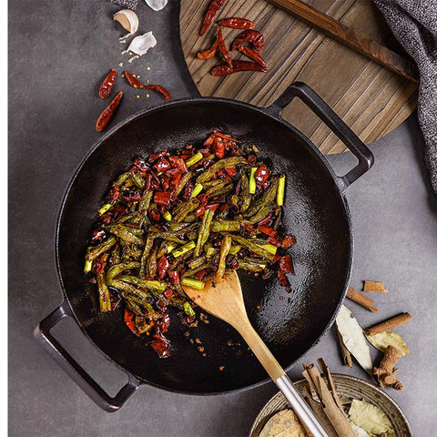 32cm Cast Iron Wok Fry Pan with Double Handle