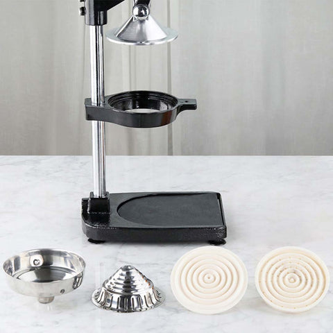 - Sturdy cast iron base with a large opening for juice collecting