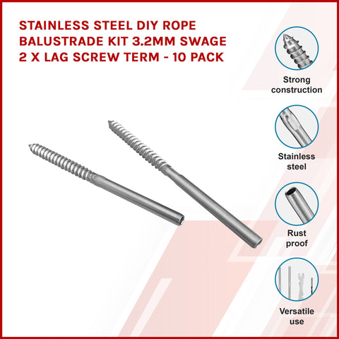Stainless Steel DIY Rope Balustrade Kit 3.2mm Swage 2 x Lag Screw Term - 10 pack